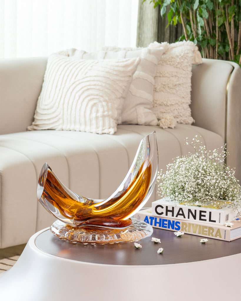 The Amber Horn by Glasremis, designed by the acclaimed Lithuanian artist Remigijus Kriukas, is a striking glass sculpture that embodies both elegance