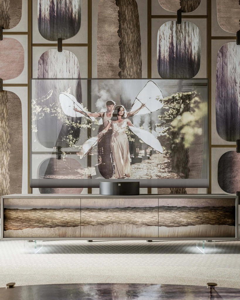 The Meiras TV Unit by Arte Veneziana, designed by Giovanni Luca Ferreri, embodies the poetic “suspension of time” inspired