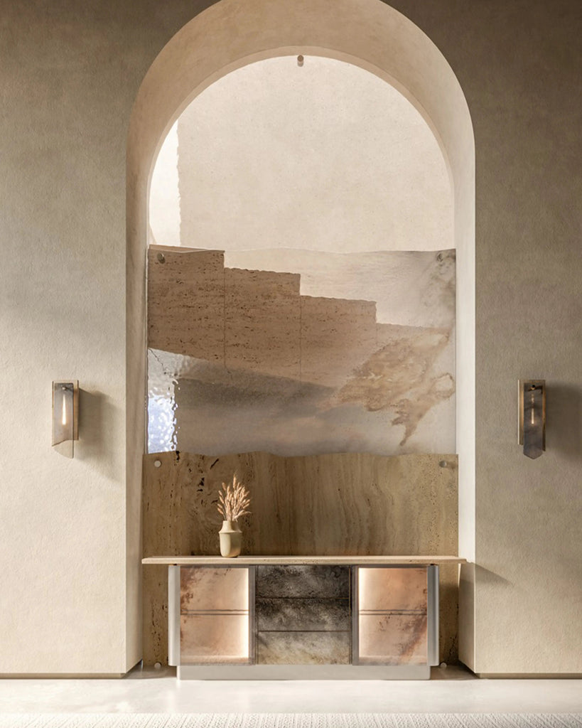 The Nemi Sideboard by Arte Veneziana, designed by Giovanni Luca Ferreri, reflects the Cave Collection’s geological artistry,