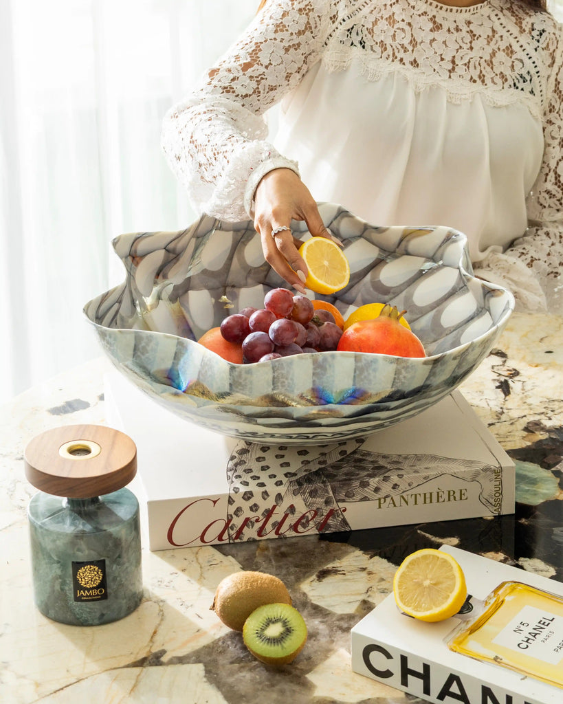 The Ostrica Medium Display Bowl (Ø 30 cm) by Yalos Murano captures the iridescent beauty of an oyster’s