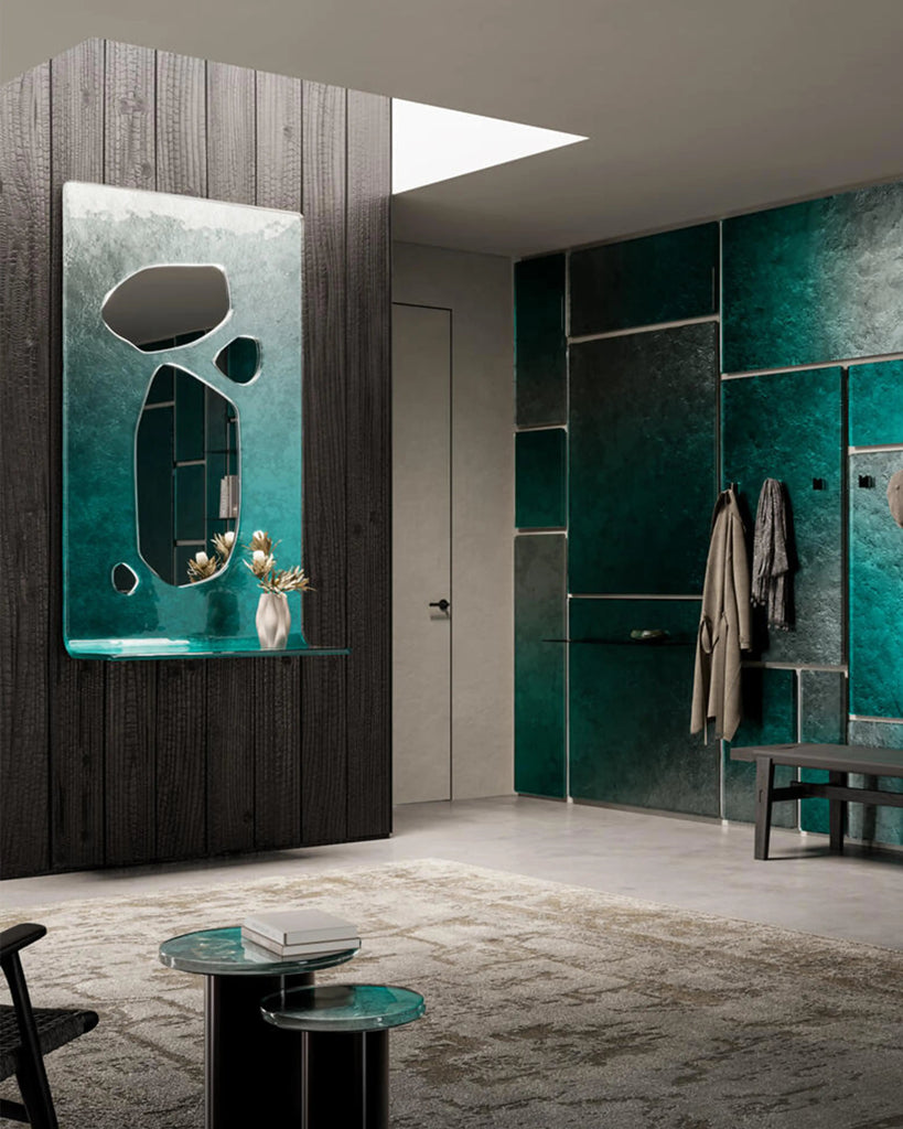 The Penasa Mirror with Shelf by Arte Veneziana, designed by Leo De Carlo, is a masterpiece that unites artistry, craftsmanship, and
