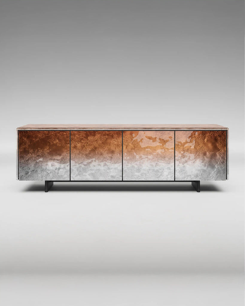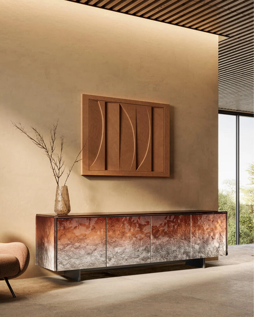 The Scoio Sideboard by Arte Veneziana, designed by Leo De Carlo, is a symphony of artistry and material innovation. Entirely handcrafted in
